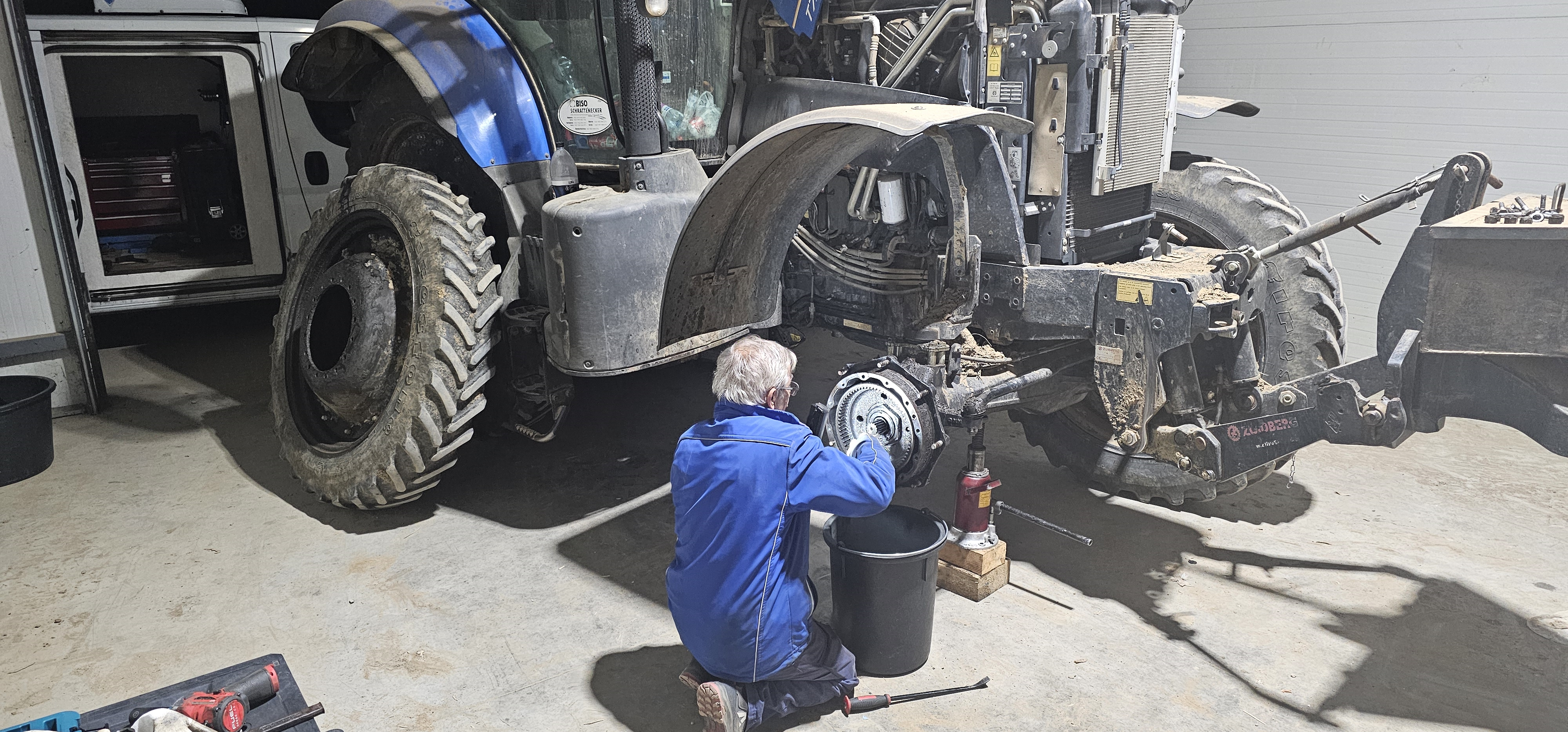 Na tomto stroji prebiehala demontáž prednej nápravy z dôvodu vôle predného náhonu.